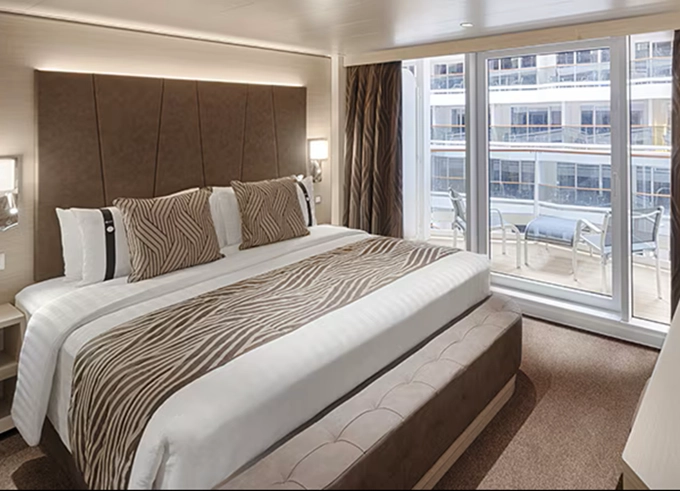 Kajuta s balkónem: 16 - 17 m², kajuta s manželskou postelí (na požádání 2 oddělené postele) a rozkládací pohovka. Klimatizace, koupelna se sprchou nebo vanou a WC, toaletní stolek, prostorná skříň, interaktivní TV, telefon, sejf, vysoušeč vlasů, virtuální asistentka ZOE. Balkony se stolkem a židlemi. Některé kajuty mají omezený výhled; kajuty PR1, PR2, PR3, PV mají výhled na promenádu.