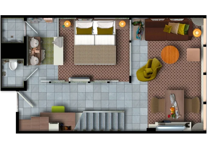 | SUHO - Himmel & Meer Suite 40 m² + prekrytá terasa 29 m² v patře se stolem, lehátky a s houpací sítí. Ložnice s obývací částí a jedálenským kútom. 15. paluba. Max 4 osoby. Výhody Suite. | 260 520 Kč 260 520 Kč za osobu |