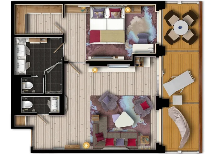 | SKTO - Themen Suite 54 m² + balkon 15 m² se stolem, lehátkom a houpací sítí. Ložnice, Obývací část, šatník. 10. paluba. Max 4 osoby. Výhody Suite. | 130 235 Kč 65 117 Kč za osobu |