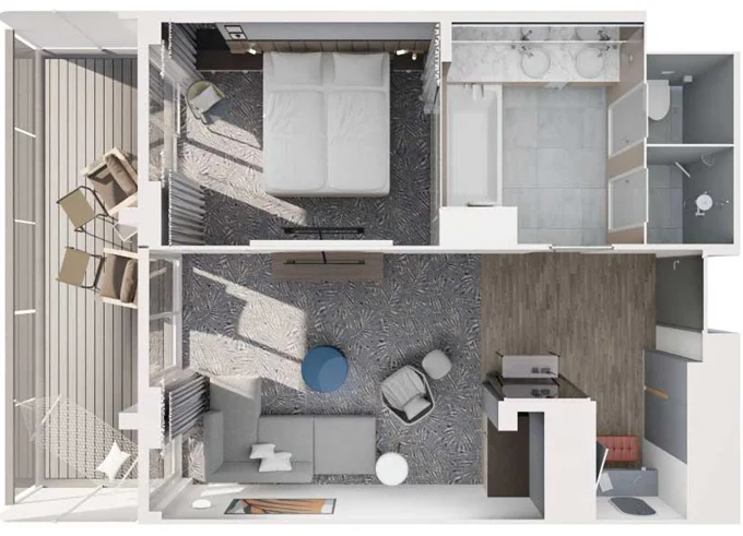 SKAO - Schöne Aussicht Suite 39 m² + balkon 10-12 m² s lehátky a houpací sítí. 7-14. paluba. Max 4 osoby. Výhody Suite. 195 327 Kč 48 832 Kč za osobu